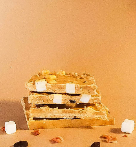 Knapperige walnoten en pecannoten zorgen voor een warme, nootachtige rijkdom die de zoetheid van de witte chocolade perfect in balans brengt. Volle rozijnen voegen kauwbare, karamelachtige smaakaccenten toe, en appelcallets zorgen voor een zachte, frisse fruitsmaak die alles prachtig samenbindt.