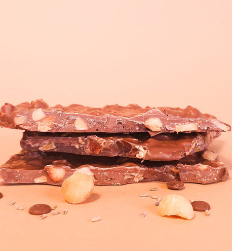 Deze chocoladebark is een zachte, elegante verwennerij met een bloemige twist. Romige melkchocolade vormt een zachte, troostende basis, terwijl boterachtige macadamianoten een delicate crunch en een rijke, ronde nootachtige smaak toevoegen. Een subtiele vleugje lavendel is door de chocolade heen geweven en zorgt voor een licht bloemig aroma dat kalmerend en verfijnd aanvoelt, in plaats van geparfumeerd.